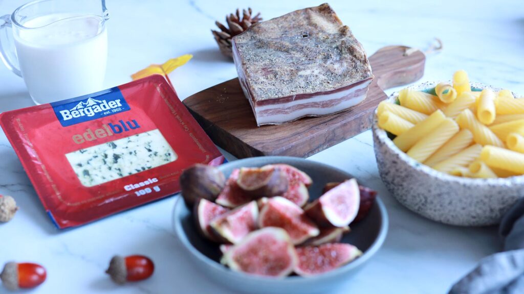 Dacă vrei o combinație surprinzătoare și delicioasă, încearcă aceste paste cu smochine caramelizate, pancetta crocantă și sos cremos de brânză cu mucegai Edelblu Bergader.