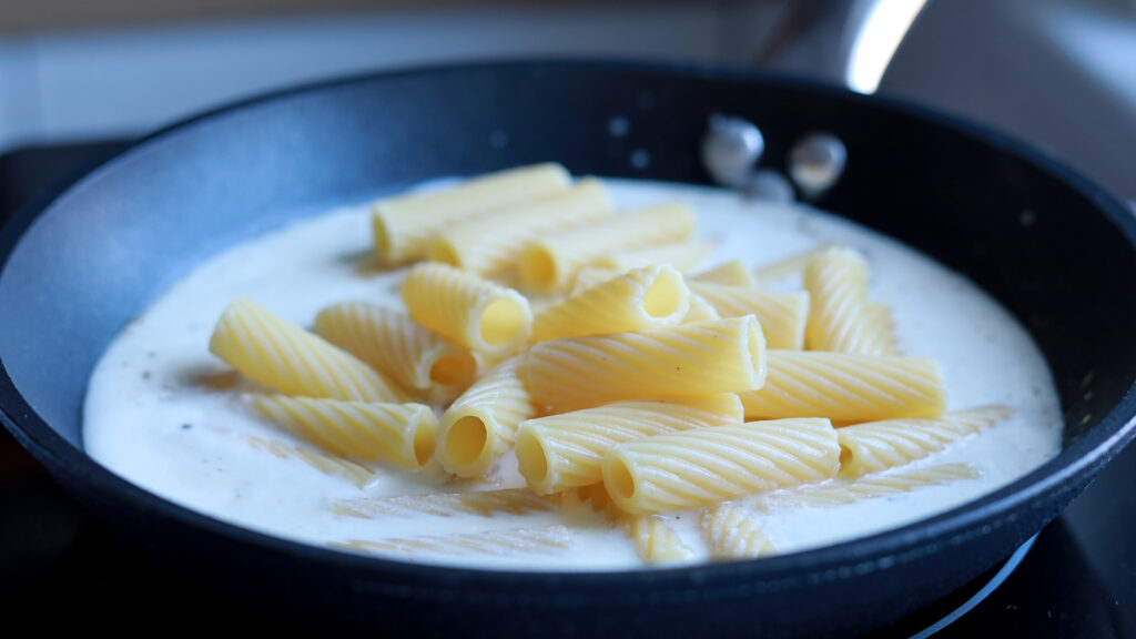 - Într-o tigaie curată, adaugi smântâna pentru gătit și jumătate de pachet de Edelblu Bergader. Se topește rapid, iar gustul este intens și cremos. Condimentezi cu sare și piper, apoi adaugi pastele fierte al dente direct în sos. Le mai lași jumătate de minut pe foc.