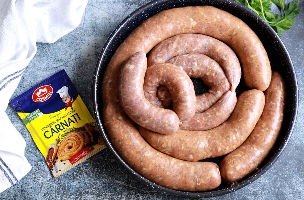 Rețetă tradițională, simplă și gustoasă de cârnați de casă, cu condimente naturale Cosmin și carne suculentă de porc.
