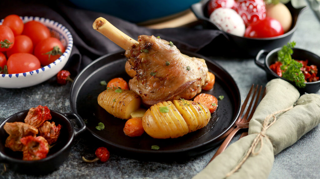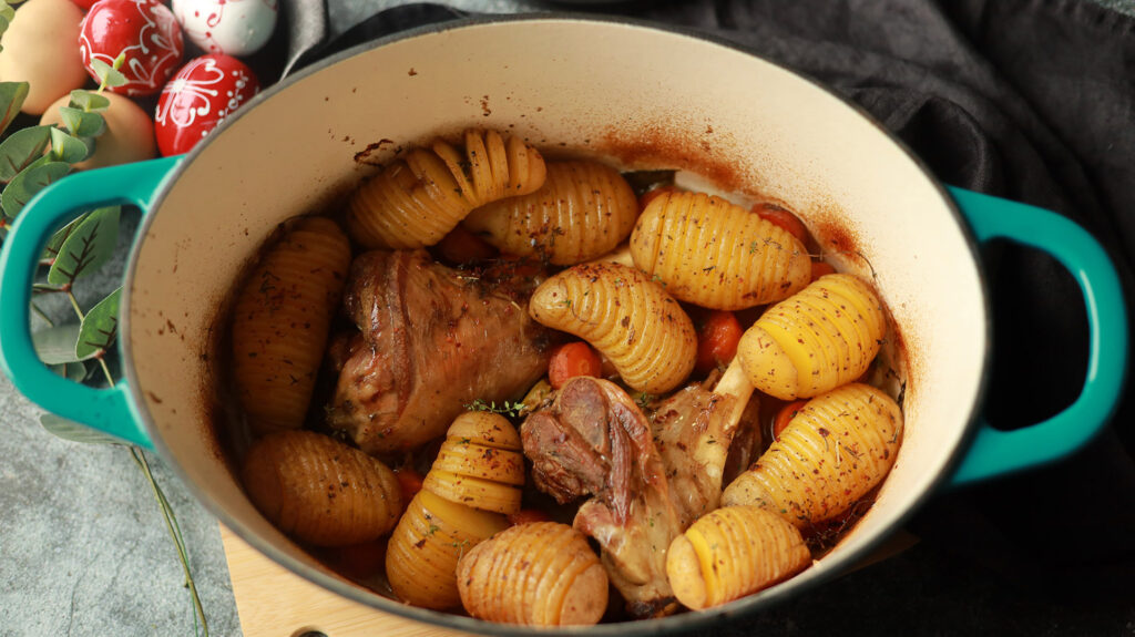 Friptură de miel fragedă cu cartofi crocanți în stil acordeon, perfectă pentru masa de Paște.