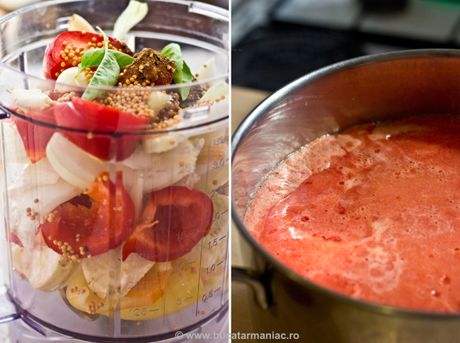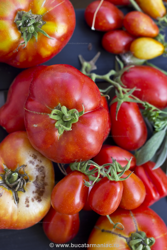 Rosiile s-au facut din abundenta. De toate marimile, formele si culorile. Ce sa facem cu ele? Ca bulion am facut si o sa mai facem o tura, am facut si un soi de sos de rosii ( poate un fel de ketchup a la BM) despre care va voi mai povesti in zilele urmatoare, am facut salate si porbabil vom pune si gogonele in muraturi. Am gasit insa raspunsul cand mi-au cazut ochii pe reteta asta., din care m-am inspirat.