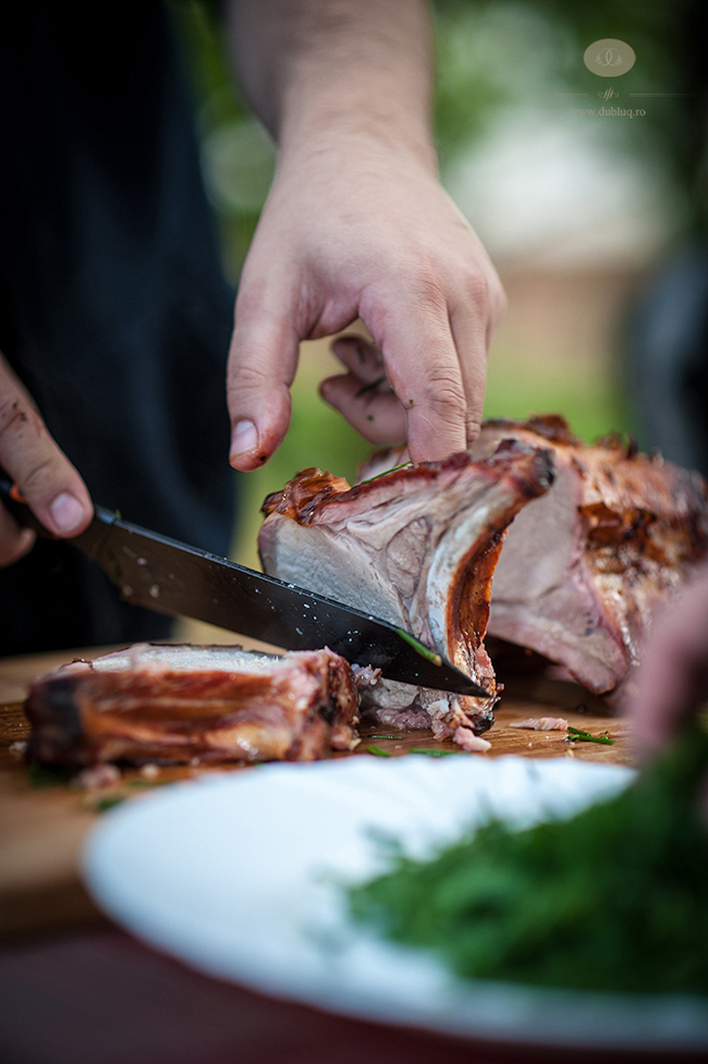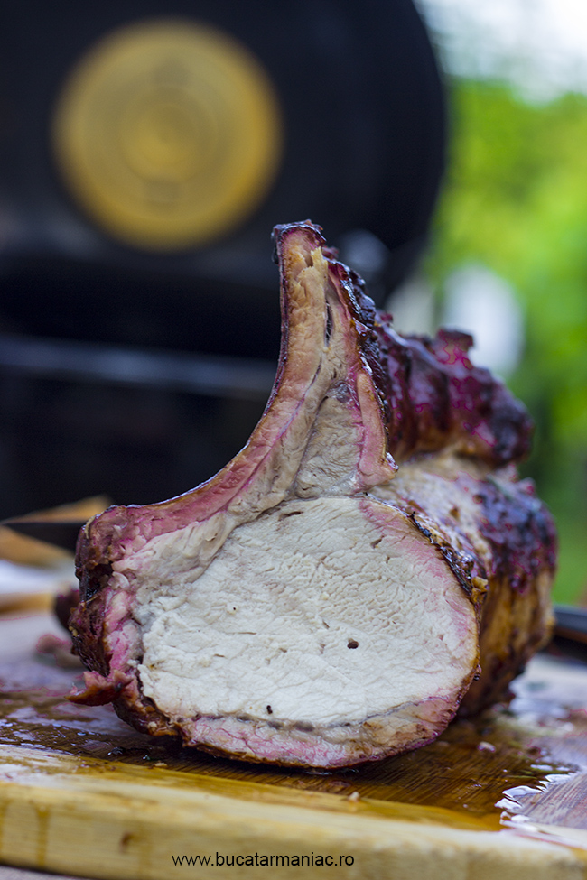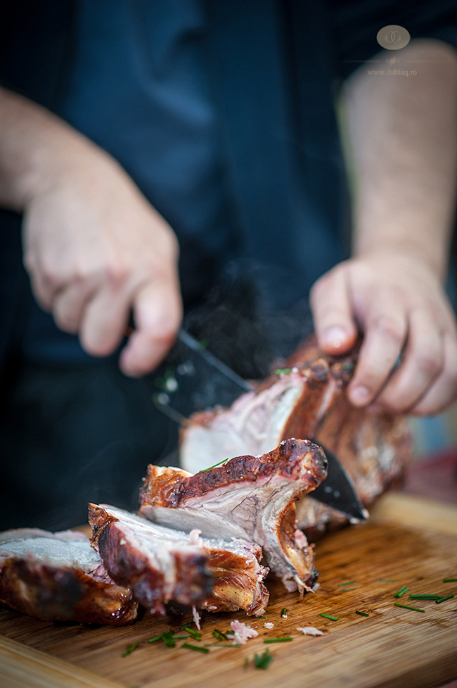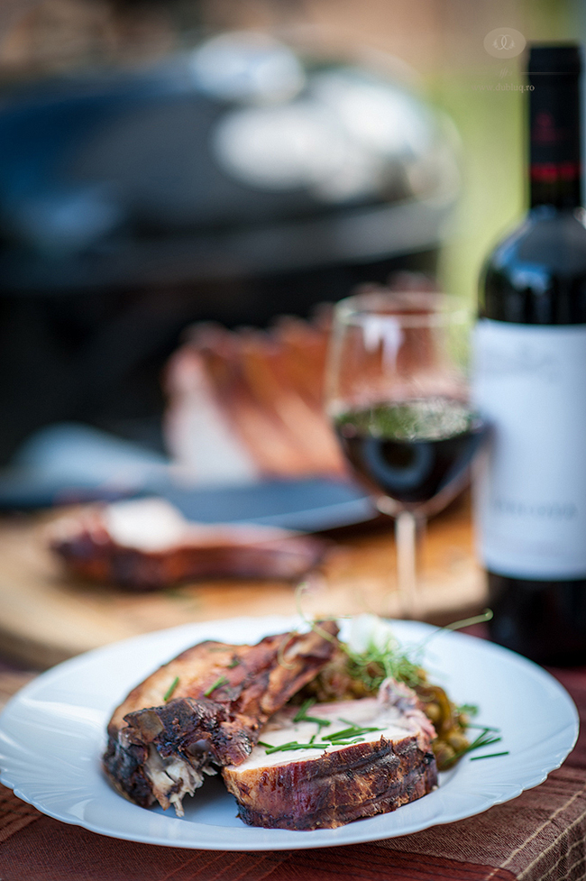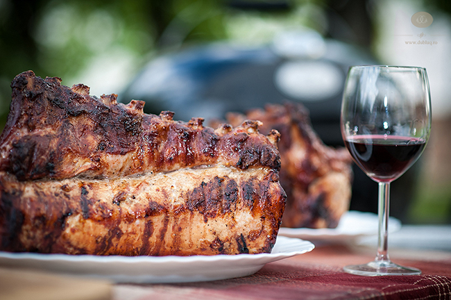 Learning by burning Arad, si anume, doua bucati intregi de cotlet de porc cu tot cu coaste pe care le-am marinat frumusel cu o seara inainte si pe care le-am tinut aproximativ 2 ore pe gratarul Outdoorchef cu carbuni, timp in care le-am si afumat cu lemnisoare de stejar provenite de la butoaie de vin. Dar sa va povestesc cum am facut: