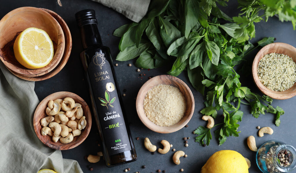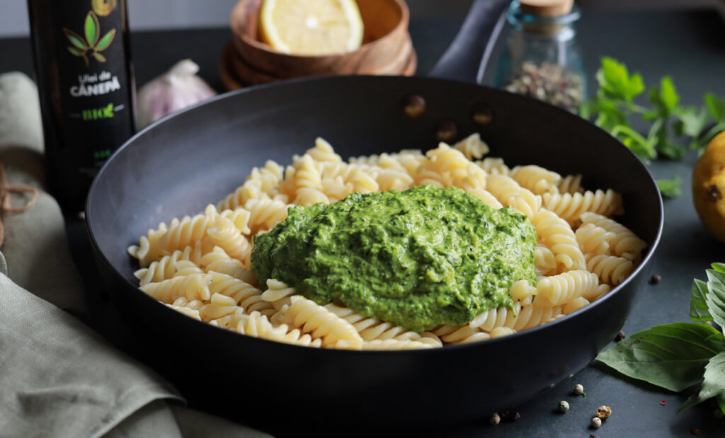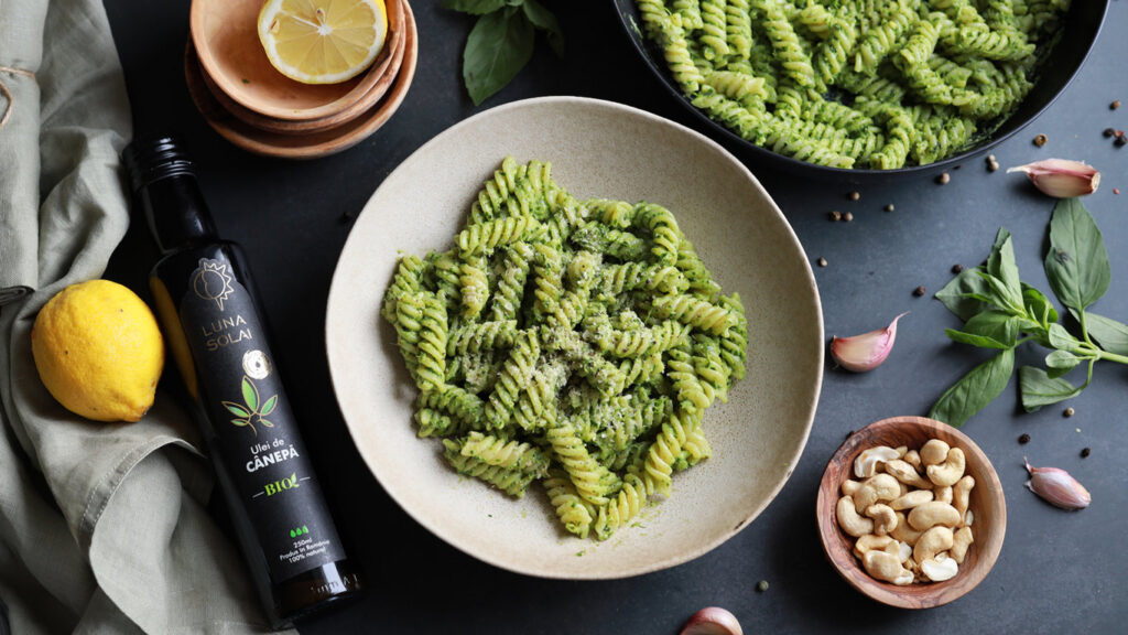 Vă invit să încercați această rețetă ușoară și aromată pentru paste cu pesto verde, de post, o variantă vegană și bogată în nutrienți a sosului pesto clasic, îmbogățit cu ulei de cânepă presat la rece bio de la Luna Solai .