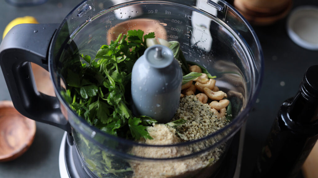 - Se adaugă toate ingredientele pentru pesto într-un robot de bucătărie și se mixează până când se obține o cremă fină. Se condimentează cu sare și piper după gust. Dacă este nevoie, se mai poate adăuga puțină apă sau zeamă de lămâie.