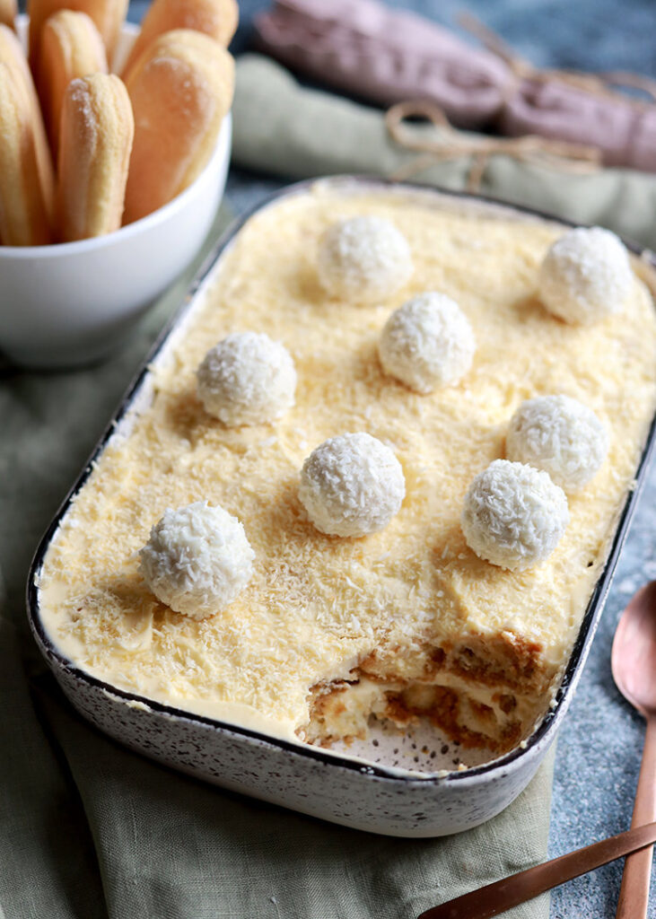 Ingrediente: ✅2 gălbenușuri de ou ✅100 ml cafea espresso neîndulcită ✅10-15 pișcoturi ✅250 g mascarpone ✅35 g zahăr ✅ un plic zahăr vanilat) ✅1 linguriță cacao ✅1 cutie bomboane Raffaello (150 g)