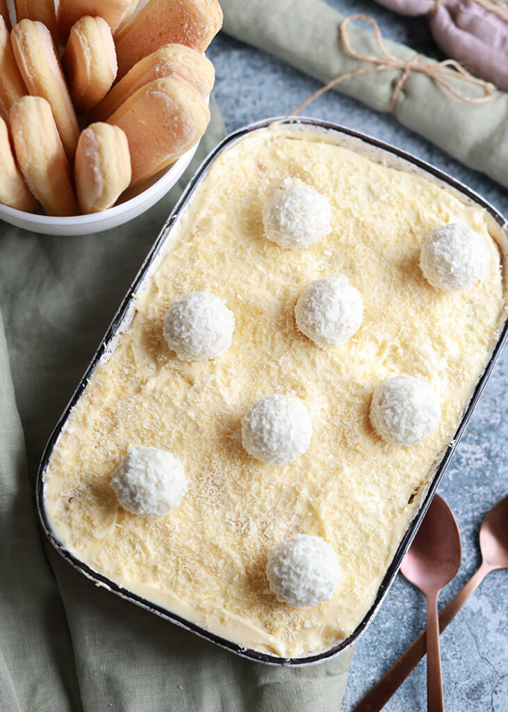 1️⃣Pregătim 200 de ml de cafea tare, fără zahăr și o lăsăm la răcit. În funcție de cât de multă cafea absorb pișcoturile este posibil să aveți nevoie de o cantitate ceva mai mare. 2️⃣Mixăm gălbenușurile de ou cu zahărul la viteză medie, până când acesta din urmă se topește și compoziția se deschide la culoare (vezi video) 3️⃣Adăugăm în cremă toată cantitatea de mascarpone și mixăm la viteza cea mai mică, doar atât cât să se omogenizeze compoziția. 4️⃣Înmuiem pișcoturile în cafea, doar o secundă, pentru că sunt foarte fragile și se vor rupe dacă absorb prea multă cafea, apoi le așezăm într-un strat într-un vas. (tavă, caserolă etc) 5️⃣Așezăm deasupra jumătate din crema de mascarpone, apoi 7-8 Raffaello zdrobite sau tăiate mărunt. 6️⃣Adăugăm încă un strat de pișcoturi înmuiate în cafea, apoi restul de cremă, iar la final presărăm nucă de cocos și decorăm cu Raffaello