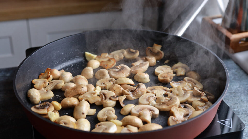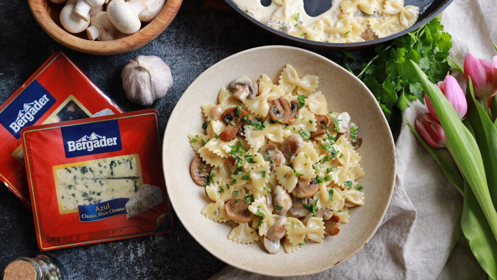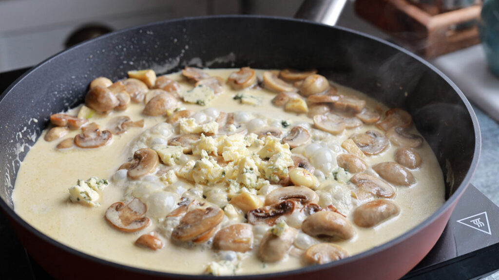Într-o tigaie am prăjit ciupercile în puțin unt cu lei de măsline și doi căței de usturoi. Am condimentat cu sare și piper. Când au devenit aurii, am adăugat smântâna și Blue cheese de la Bergader.