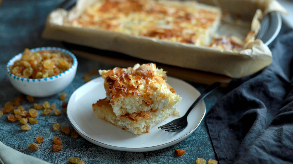 Plăcintă creață dulce, cu foi crocante și umplutură cremoasă de brânză și stafide, ușor de făcut și extrem de gustoasă.
