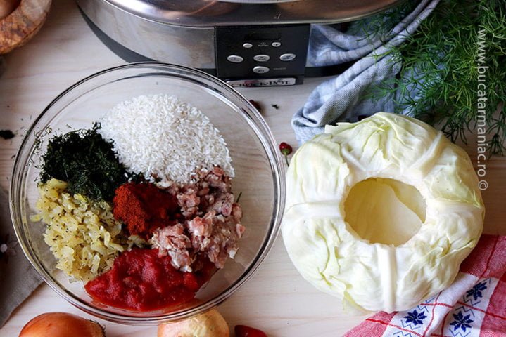 Vă spuneam și cu alte ocazii că motivul pentru care am ales acest model de slow cooker Crock-Pot 5,7 l Digital este pentru că e foarte încăpător. Și acum am reușit să potrivesc în el nu una, ci două astfel de sarmale uriașe. Pentru această rețetă va trebui să alegeți varza în așa fel încât să încapă în slow cooker-ul vostru (indiferent de model)